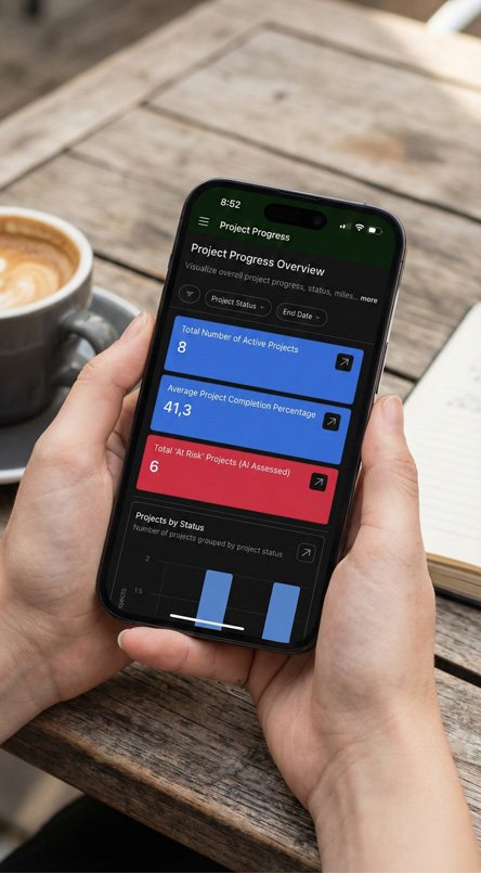 Dashboards donde Ventas puede ver el avance del proyecto sin interrumpir a Operaciones. Transparencia total sobre el estado de la entrega.